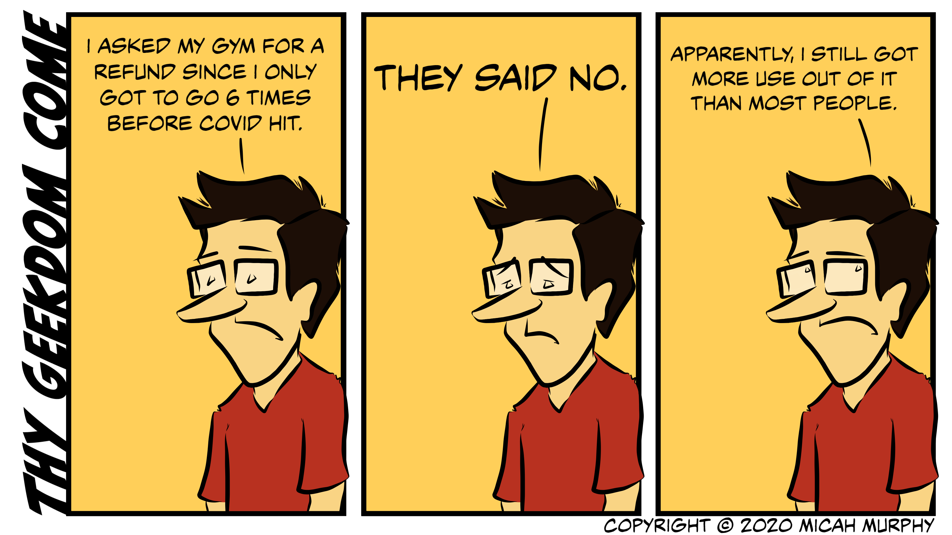 Gym Refund by Micah Murphy | Mar 12, 2020 | Archive, Comics | 0 comments Submit a Comment Cancel replyYou must be logged in to post a comment.